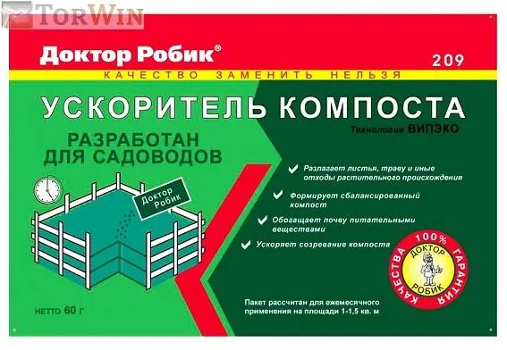 Преимущества: Простой в использовании Доктор Робик 209 не содержит едких веществ, безвреден для окружающей среды; ежемесячное применение Доктор Робик 209 позволяет в сжатые сроки получать обогащенный питательными веществами компост, являющийся идеальным средством для подкормки и пересадки растений.