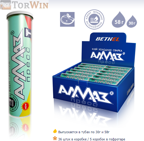 Клей Алмаз-пресс для ремонта сантехники соединяет разнородные материалы, обеспечивая высокую адгезию и прочность, в том числе к мокрым и замасленным поверхностям.
