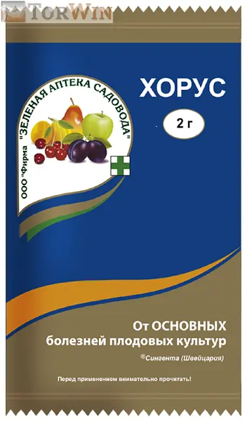Применение: Первое ранневесеннее опрыскивание Хорусом проводят до распускания почек, чтобы не допустить заражения; повторно через 7-10 дней для закрепления успеха; препарат суперактивен в самых малых дозах: 2 г достаточно для обработки небольшого сада.
