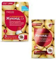 Действие: Жукоед обладает высокой скоростью действия и уничтожает даже скрытоживущих вредителей и питающихся на нижней стороне листа; препарат воздействует даже на особи резистентные к одному из его компонентов; полная гибель колорадского жука и его личинок наступает в течение 24 часов.
