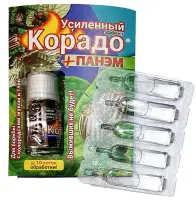 Корадо защищает картофель от вредителей в течение 3-4 недель после опрыскивания; достаточно 1 мл препарата (разведенного по норме) на 1 сотку картофеля; препарат не чувствителен к жаре и не смывается дождем.