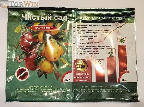 Инсектицид - фунгицид Чистый сад стимулирует рост растений, повышает их урожайность, восстанавливает рост и повышает качество урожая, обладает длительным действием, экономный при обработке.