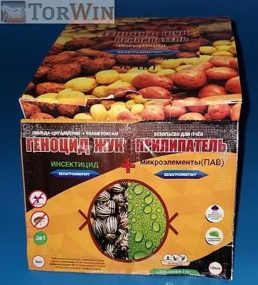 Применятеся Геноцид Жук в виде рабочего раствора: 1 пакет препарата на 5-10 л воды (1-2 сотки), а при обработке клубней и семян - 1 пакет на 2-3 л воды (на 20-50 кг картофеля; 200 мл на 100 г семян).