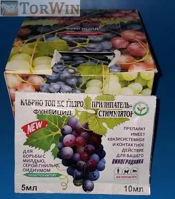 Препарат Кабрио Топ Гидро + прилипатель + стимулятор применяется в виде рабочего раствора: для профилактики разводится 1 пакет на 10 л воды на 1-2 сотки; для лечения 1 пакет на 5 литров воды на 1 сотку.