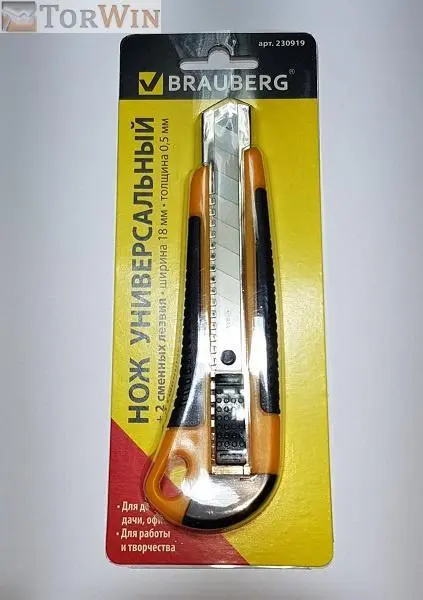 Нож универсальный BRAUBERG автофиксатор, резиновые вставки (18 мм + 2 лезвия, блистер, 230919)