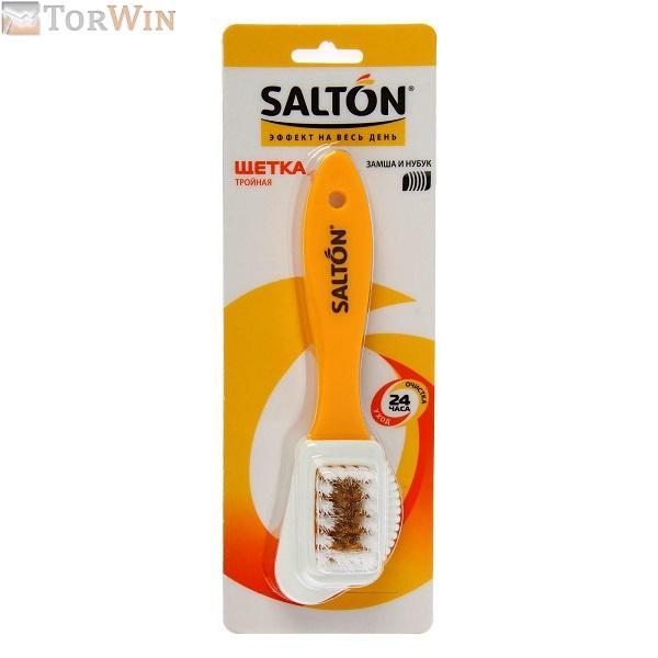 Щетка Салтон имеет три очищающих поверхности: 1. синтетическая щетина со вставкой из латунной проволоки для очистки сухих загрязнений; 2. резиновые боковые поверхности для швов и рантов; 3.резиновая рельефная поверхность восстанавливает бархатистость.