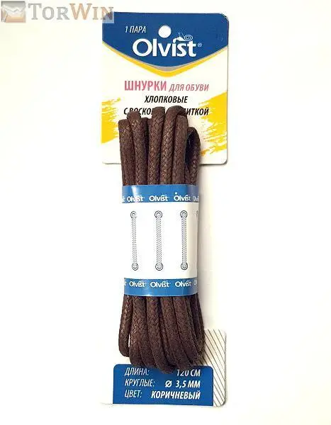 Круглые средние коричневые шнурки Olvist выпускаются длиной: 90 см (на 6-7 отверстий); 120 см (8-9 отверстий), отлично подходят для классической и других видов обуви соответствующего цвета.