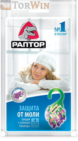 ПРИМЕНЕНИЕ: Секция от моли РАПТОР после извлечения из упаковки подвешивается или размещается в местах хранения одежды (шкаф, гардероб, комод и т.п.) из расчета 2 секции на 0.5 куб. м, максимальный срок эффективной защиты - 4 месяца.