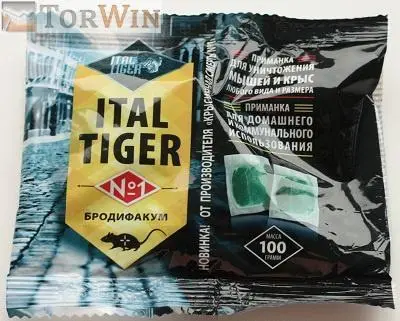 Ital Tiger №1 — тестообразная приманка, которая имеет в своем составе Бродифакум с концентрацией 0,005% производства итальянской компании «Activa S.r.l», что обеспечивает высокую эффективность и стабильность приманки, а также муку, сахар, душистое подсолнечное масло и уникальные ароматизаторы для обеспечения максимальной привлекательности и поедаемости.