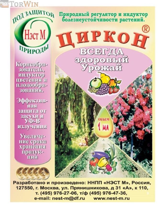 Свойства: Циркон увеличивает всхожесть семян, особенно некондиционных; укореняет рассаду, черенки, в т.ч. хвойные; защищает от стрессов, предотвращает опадение завязей, плодов; снижает фитофтороз картофеля и томатов, пероноспороз огурцов, паршу картофеля и яблони, бактериоз, фузариоз, корневые гнили, особенно серую гниль земляники, мучнистую росу роз и чёрной смородины, монилиоз косточковых и т.д.; уменьшает норму ядохимикатов при совместном введении.