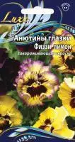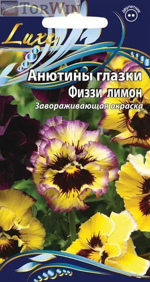 Цветы диаметром 6–8 см, махровые, желтые с сиреневыми гофрированными краями и коричневым центром.