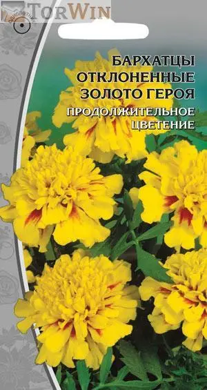 Соцветия гвоздиковидные, золотисто-желтые, крупные, диаметром 5–6 см. Цветет обильно с июля по октябрь.