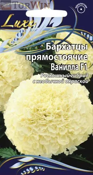 Соцветия махровые, крупные, диаметром 7-8 см, бело-кремового цвета, долго сохраняют свежесть в срезанном виде.
