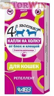 Применение: Наносят капли Четыре с хвостиком, раздвинув шерсть, на кожу животного вдоль позвоночника в несколько точек в области спины между лопатками, головы и у основания хвоста, в дозах, указанных в инструкции по применению (см. внутри упаковки).