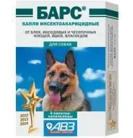 Дозы и порядок применения: Однократная обработка путем капельного нанесения капель Барс на сухую неповрежденную кожу в области спины собаки между лопатками или в область шеи у основания черепа в установленных дозах (подробнее в инструкции). Повторная обработка - по показаниям.