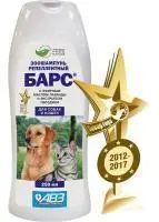 Свойства: Зоошампунь репеллентный Барс обладает выраженным репеллентным действием в отношении эктопаразитов собак и кошек; растительные компоненты шампуня не всасываются в системный кровоток, задерживаются на коже и шерстном покрове животного, где проявляют отпугивающее действие на насекомых и клещей; обладает моющими свойствами, увлажняет и смягчает кожу, снимает зуд и раздражение, придаёт шерсти естественный блеск, предотвращает ее выпадение и ломкость.